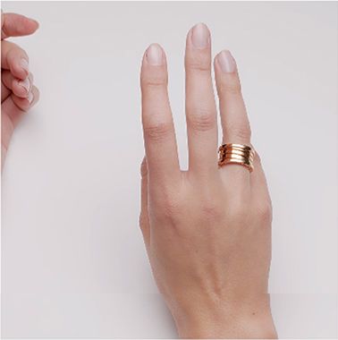 由于Bulgari宝格丽B.zero1系列戒指的独特设计,戏环的效量会影响戏指的高度和佩戴方式,因此其尺寸不同于标准戒指尺寸。在购买B.zero1系列戒指时,我们建议您遵循推荐尺寸表,以确保佩戴合适,